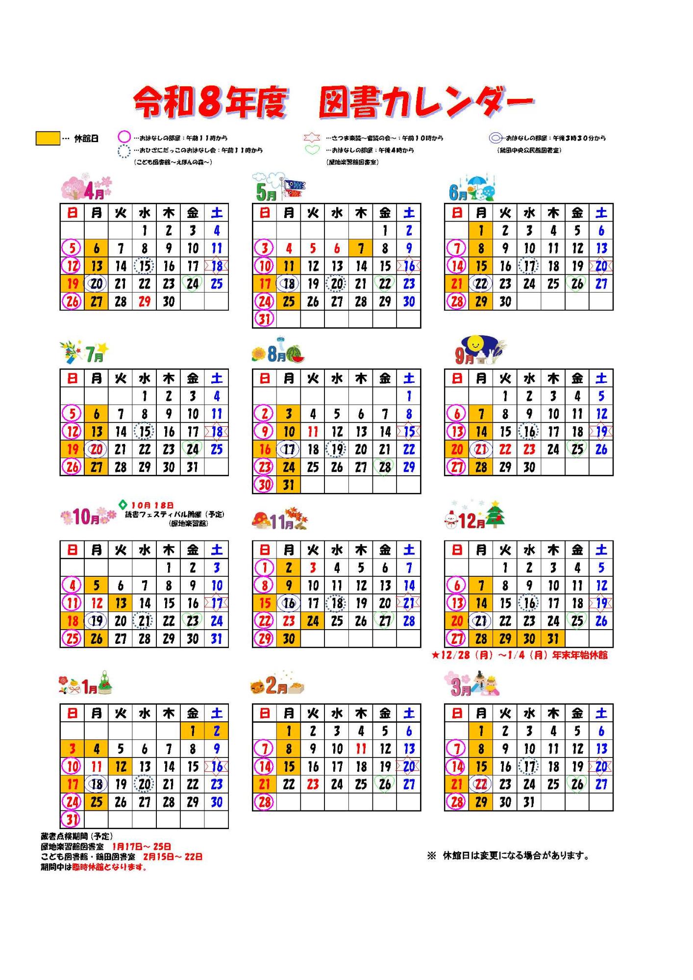 令和8年度図書カレンダー Tweet 更新日:2026年04月15日 令和8年度 図書カレンダー (PDFファイル: 227.8KB) この記事に関するお問い合わせ先 さつま町役場 社会教育課 社会教育係〒895-1803鹿児島県薩摩郡さつま町宮之城屋地1565番地2電話番号:0996-26-1842ファックス:0996-53-0007メールフォームによるお問い合わせ