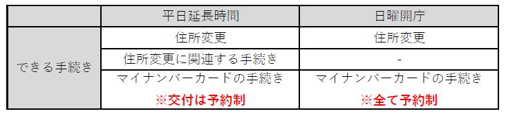 (注釈)日曜開庁は以上の手続きに対応していません。後日通常の開庁時間内に来庁してください。