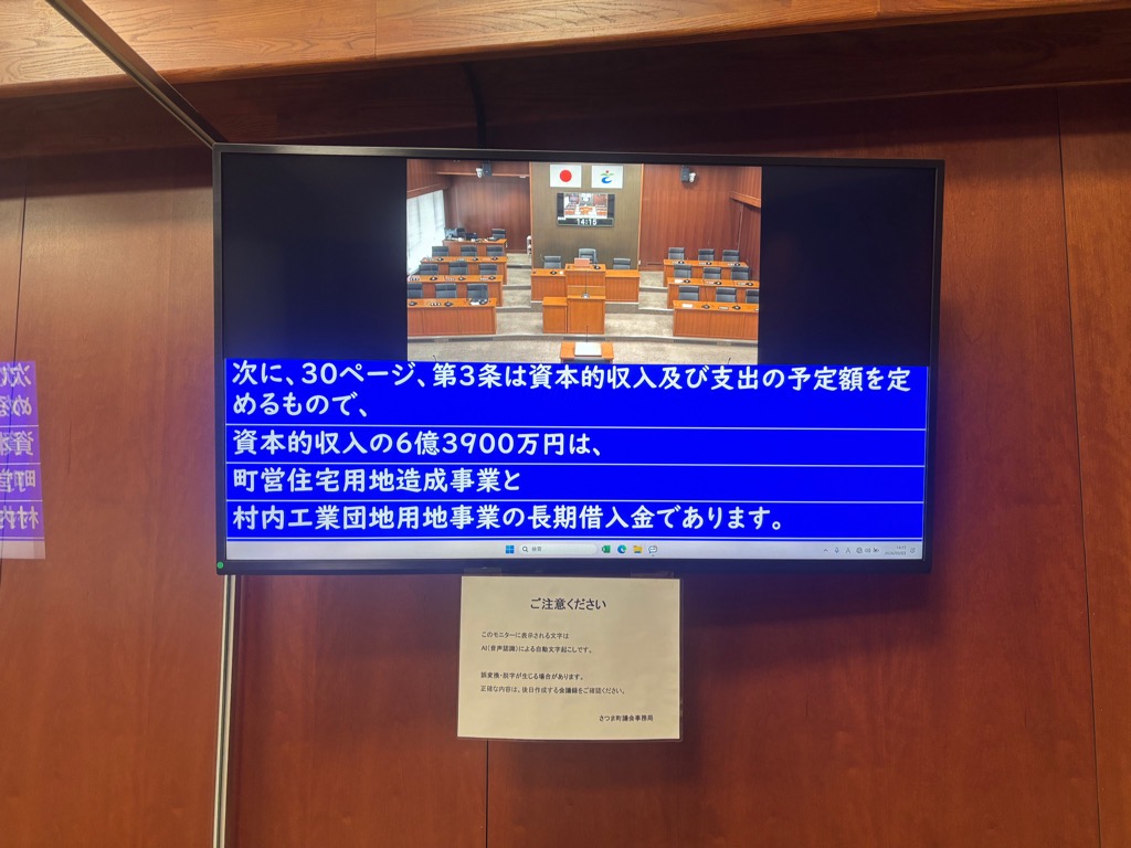 さつま町議会は「開かれた議会」の実現に向け、議会中継のデジタル化・高度化を推進しました。 モニターの設置やAI音声認識システムの導入により、傍聴者・インターネット視聴者の皆さまが、 審議内容をより正確かつ分かりやすく把握できる環境を整備しました。