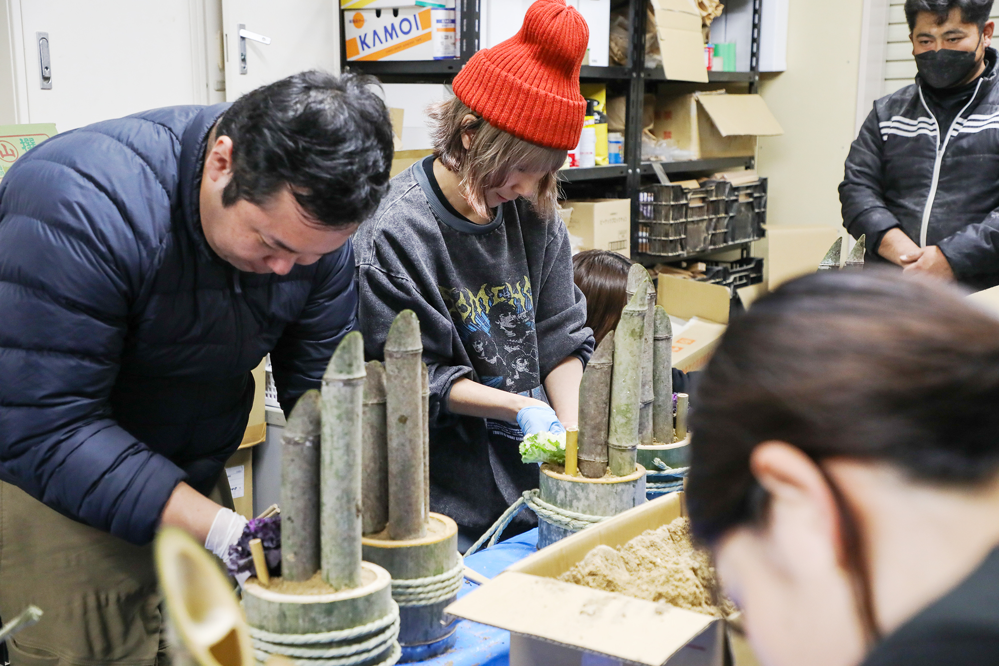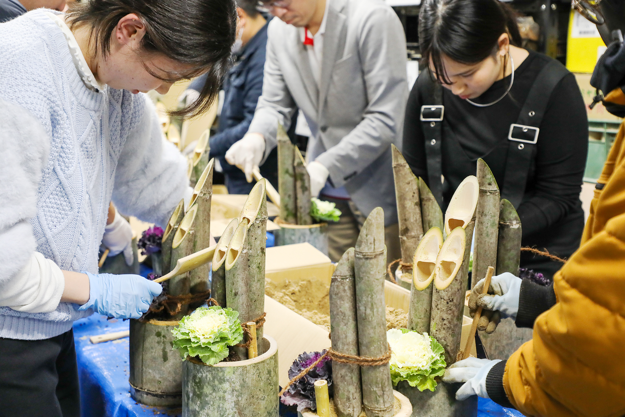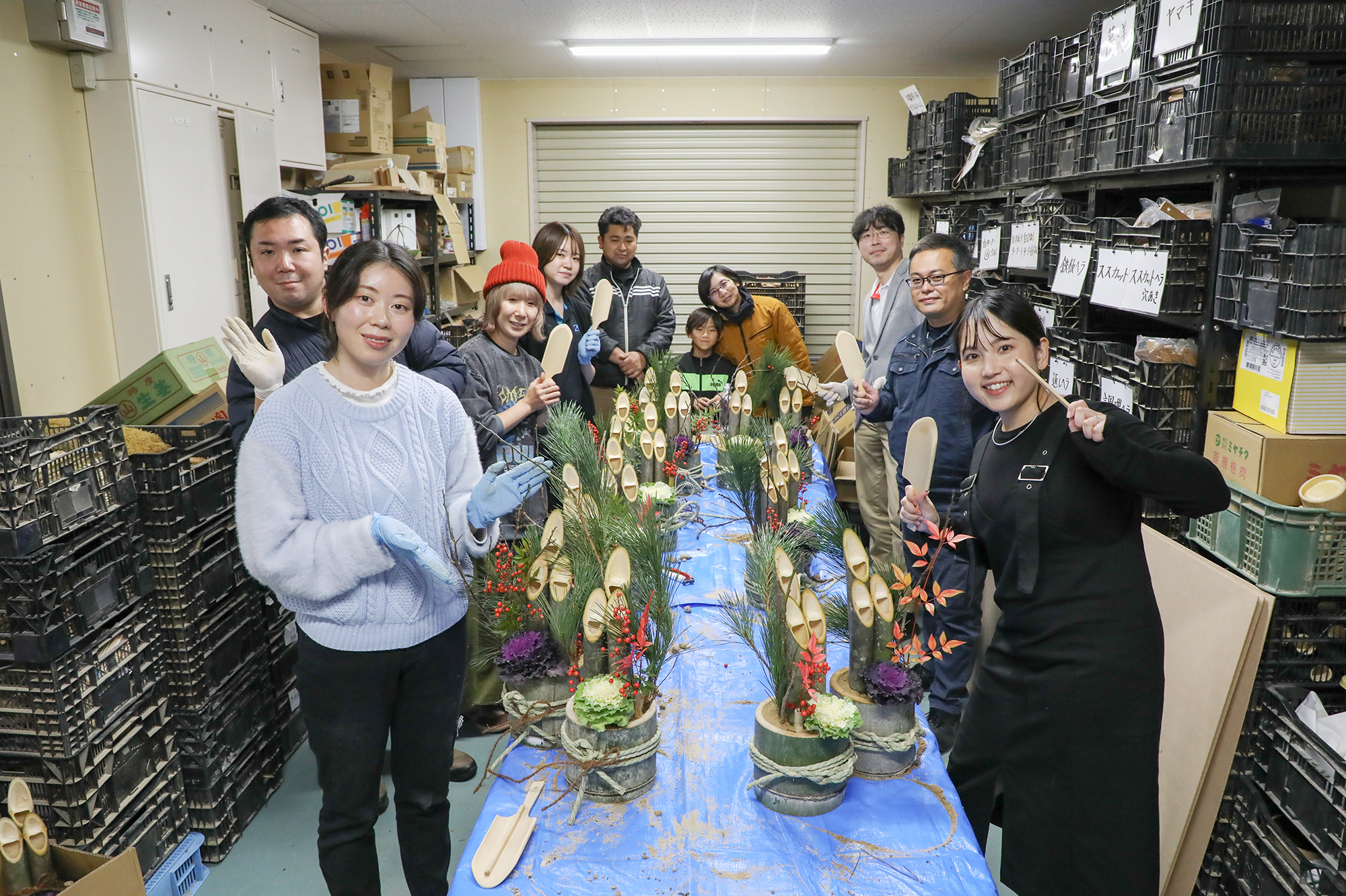 第2回目は「西田竹材」さんで開催し、竹の町ということで7名でワイワイ話しながらミニ門松作りをしました。各自持参した装飾品を付けるなどして趣向を凝らしたオリジナルの作品が出来上がっていました。